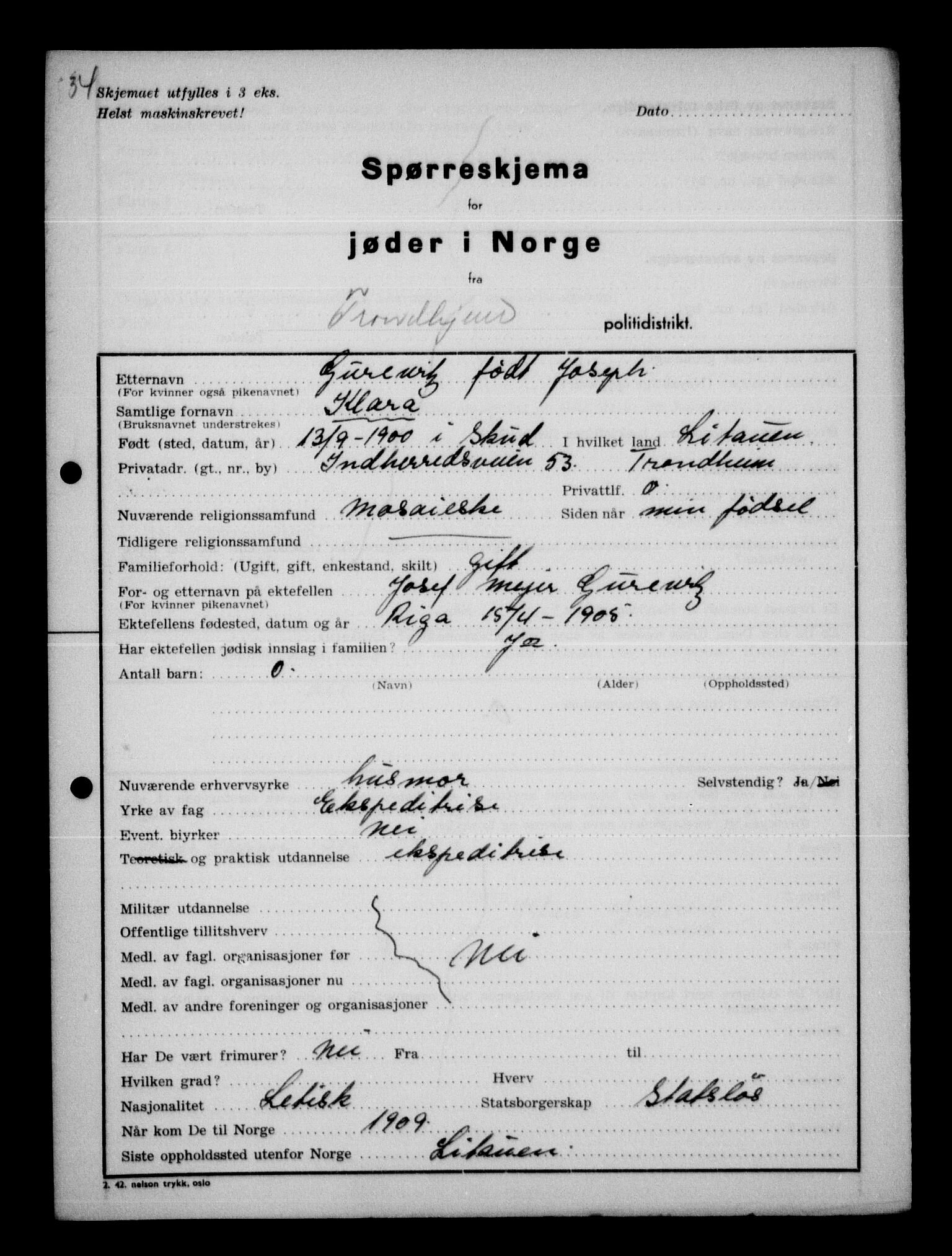 Under: Kopi av spørreskjemaet til Klara Gurewitz. Disse skjemaer var nyttige instrumenter i jakten på jødene. Ill.: Jødisk museum, Trondheim.
