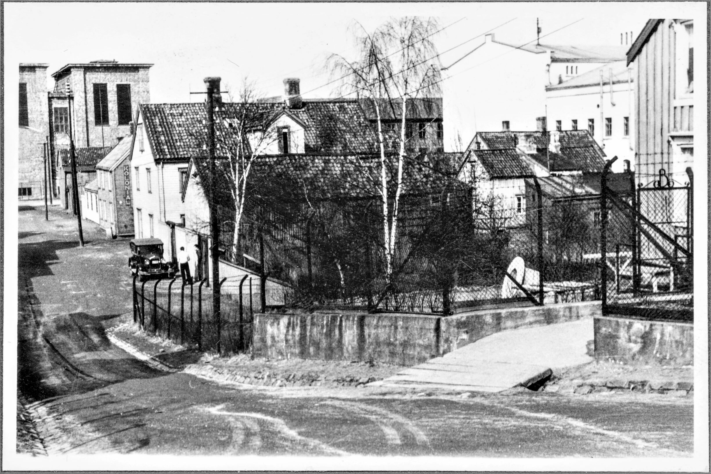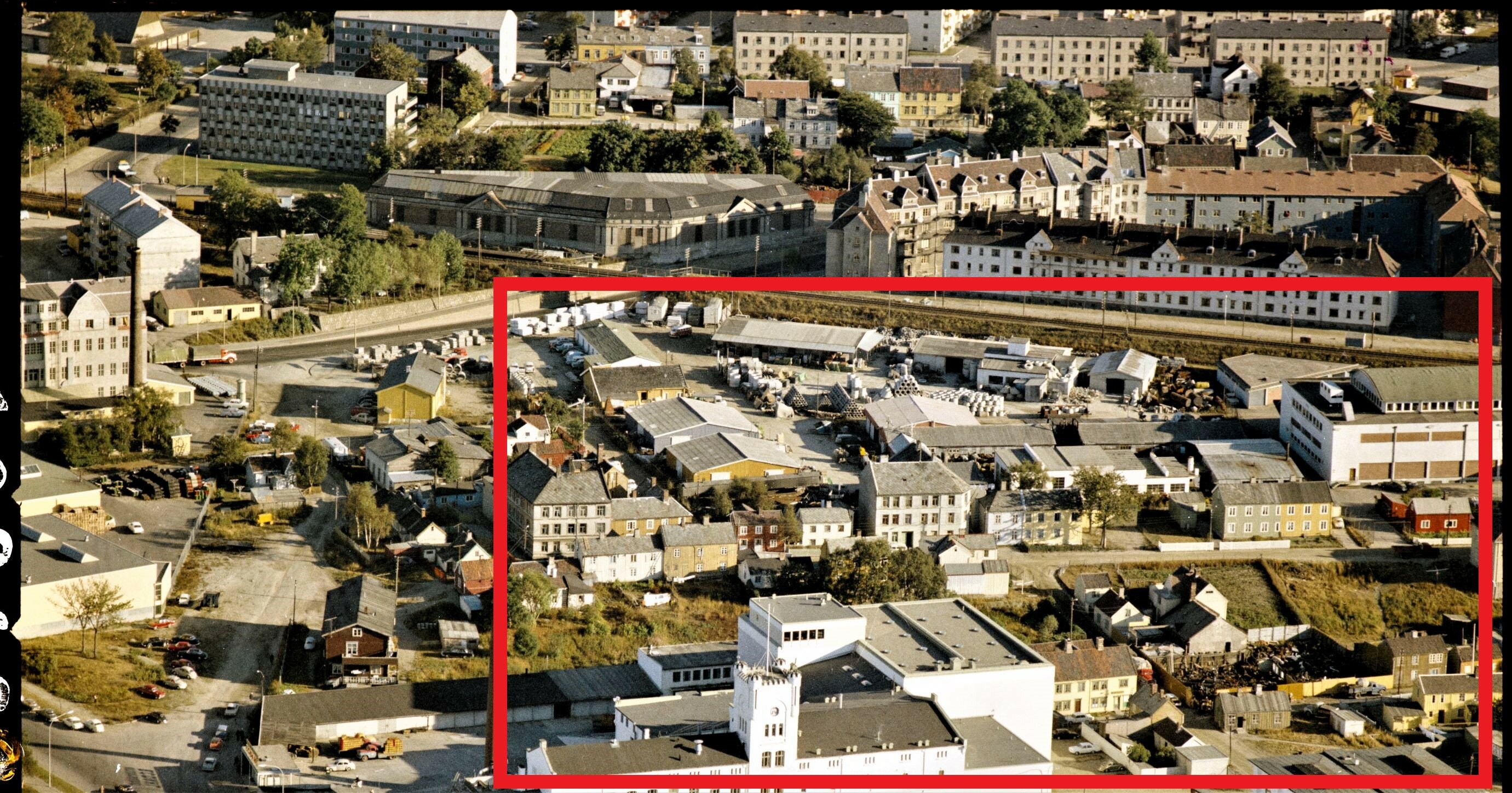 I dette bildet fra Gunnerus-samlingen ser vi et sjeldent glimt av Østersunds gate 2 (innringet), som brant før jul i 1968. Rett nedenfor står også den gamle trafoen. Ellers er farvebruken mye godt den samme som i dag. Området på Nyhavna må ha vært magnet for nysgjerige barn. Det er langt flere jernbanespor enn i dag. I Strandveien 23 er det fortsatt farvehandel.