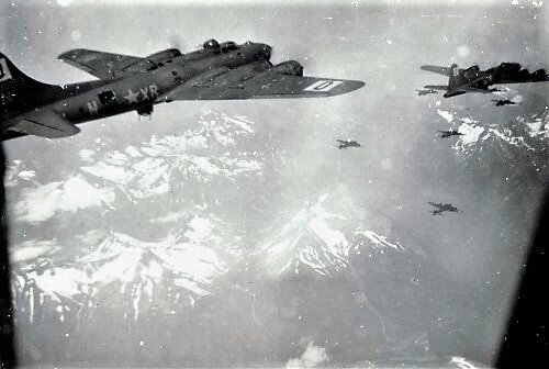 Over: Flying Fortress B-17F 42-30161 'Cuddle Cat' 335th BS, 95th BG, 8AF USAAF. Overflies Trondheim, Norway. NB! Det er Aukra flyet er rett over.