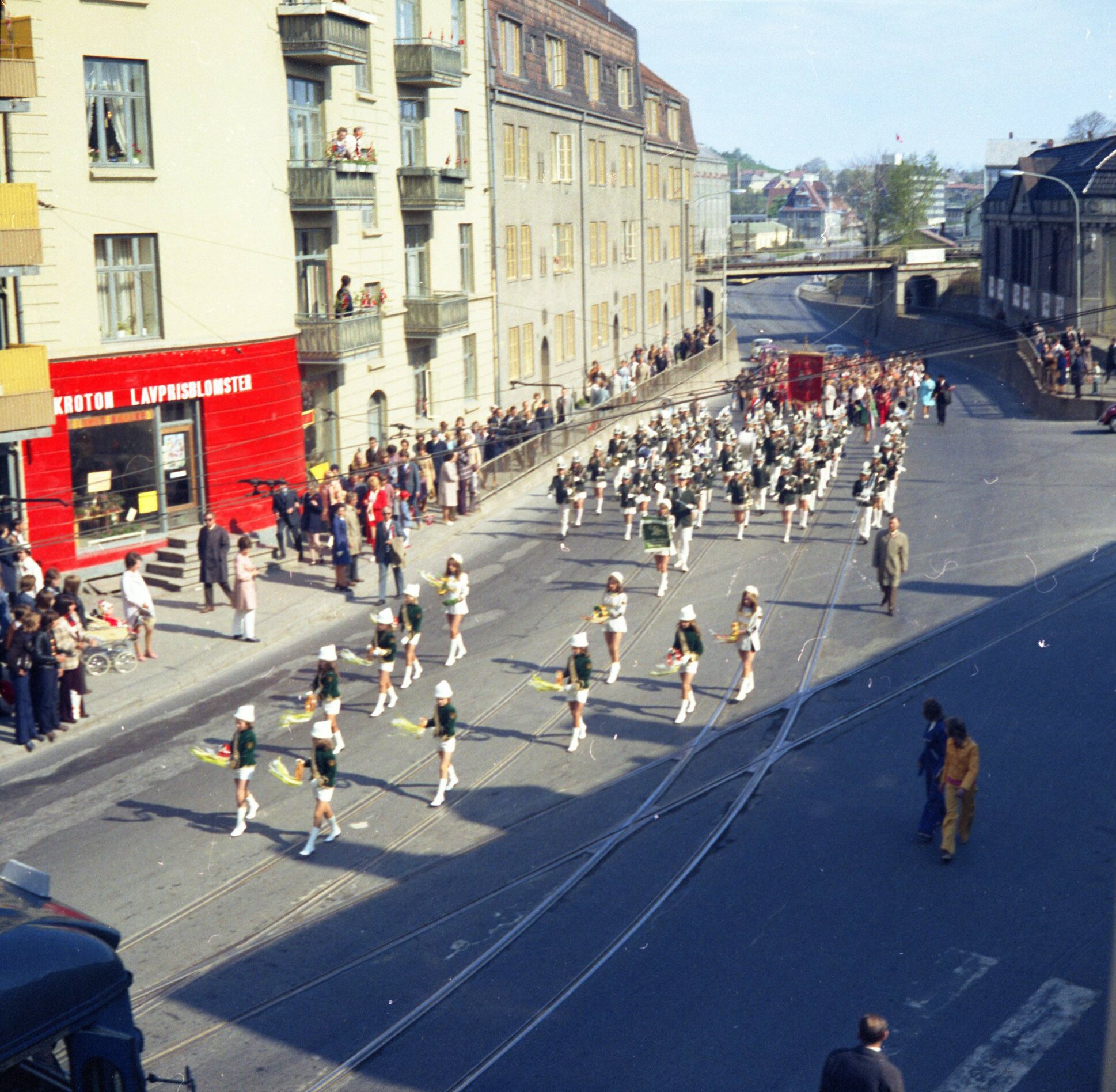 Bildet er tatt 17. mai 1972 av Fritz Digre. Trikkeskinner, flagg på verandaer, slengbukser.