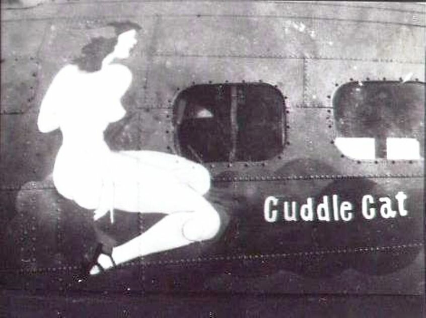 Over: Dekor på et av bombeflyene som deltok i angrepet på Dora. Flying Fortress B-17F 'Cuddle Cat' 335th BS, 95th BG, 8AF USAAF.