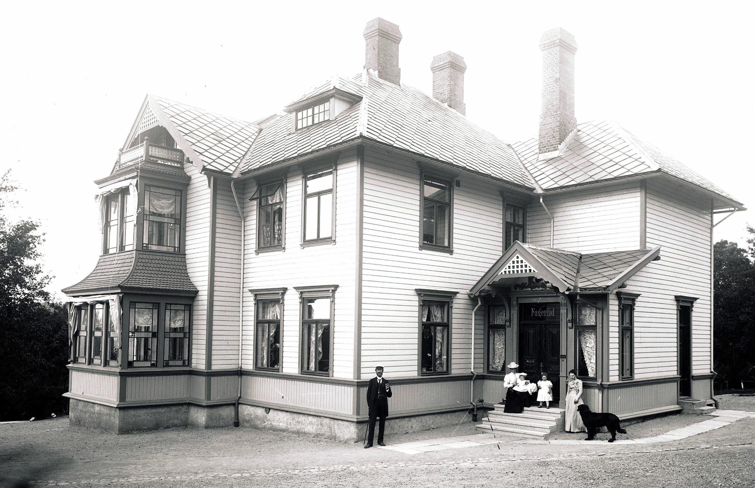 "Rentier Smith's villa Fagerli (Fagerlid) i Jebeveien 4 på Strinda. Fagerlid var parsell av Perstua som opprinnelig hørte til Rønningen. I 1873 ble eiendommen delt i to, Fagerli Østre og Fagerli vestre. Smith kjøpte eiendommen og brukte den som landsted. Foran inngangspartiet står tre voksne og to barn, antagelig familien Smith, og en hund. Familiegruppe."