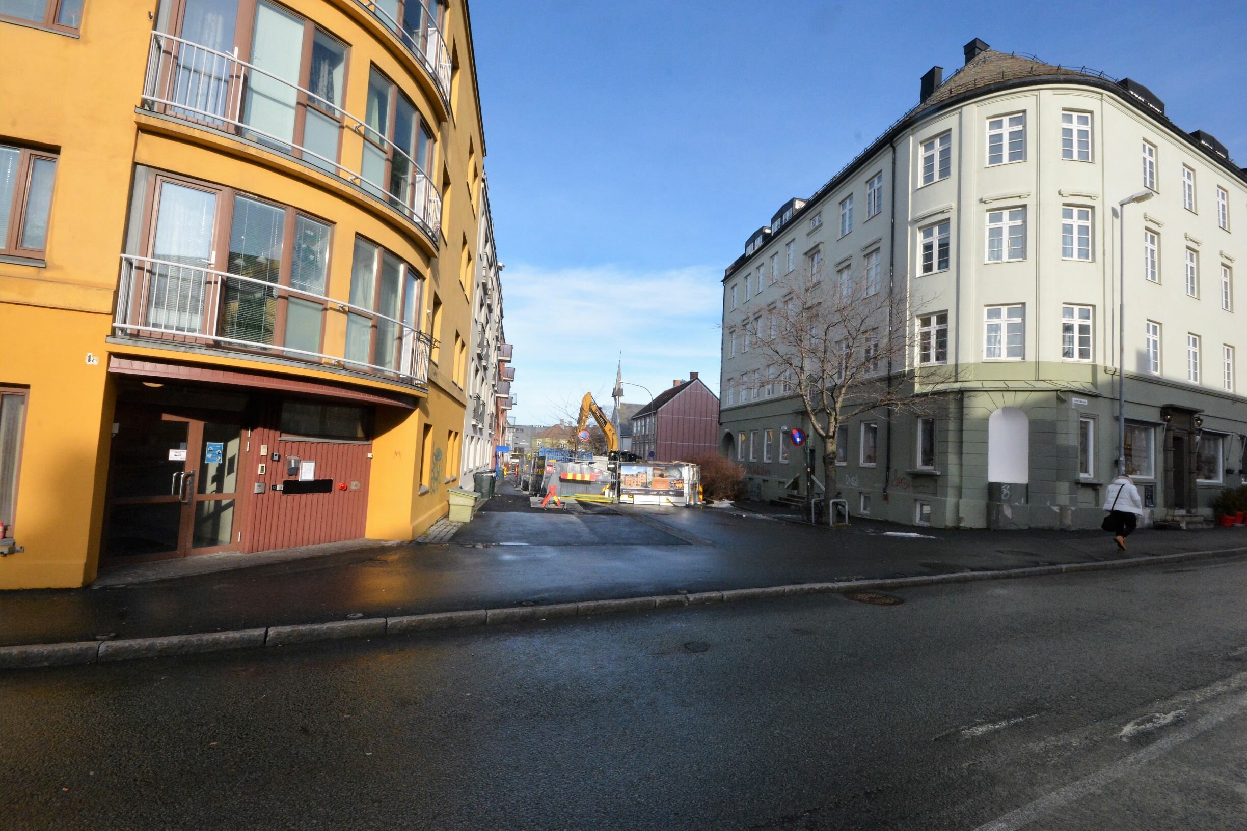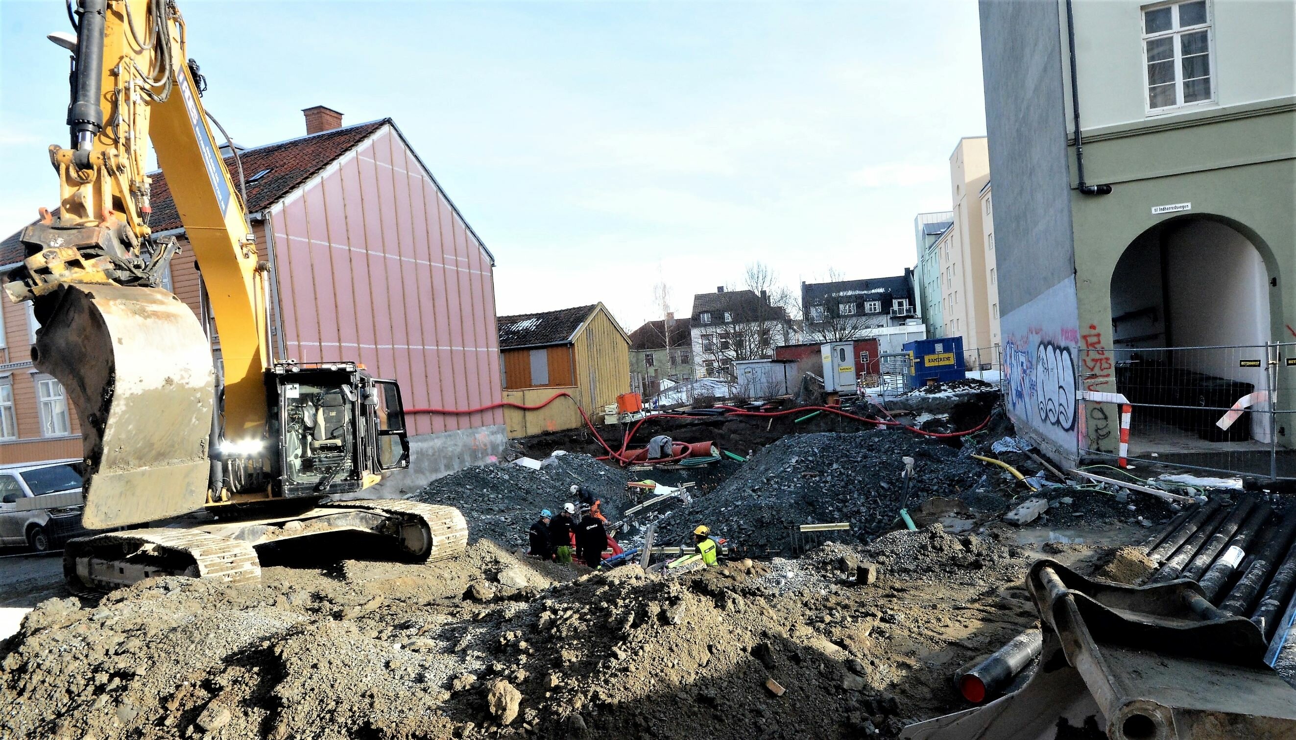 Under: Det kan være utfordrende å kjenne seg igjen på bildet under slik det fremstår i februar 2021. Den rosa veggen til venstre på bildet er Skomakergården den skomaker Aalberg holder til i Fjæregata 3. Husene rett frem tilhører Gregus' gate, mens Innherredsveien 50 er gården til høyre med den buede inngangen. I byggegropen vil det vårparten 2022 stå hus på fem etasjer. Foto: Bjørn Lien.