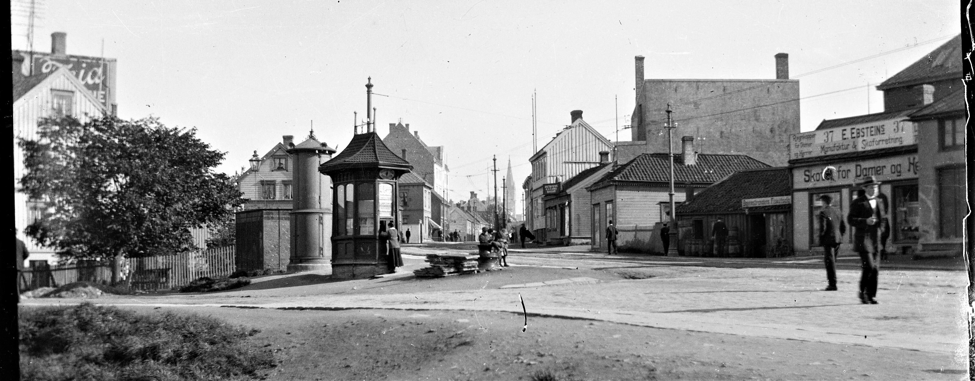 Anker Maalø tok dette innholdsrike bilde av Innherredsveien ca. 1919.Fra høyre har vi Elias Ebsteins ganske nye forretning i Innherredsveien 37 med "skotøi" og manufaktur og Bakkestrandens Fiskutsalg. På venstre side den flotte kiosken som stod i mange år, trafon, pissoiret og nedkjørselen til Strandveien. Fortsatt i 1919 preges Innherredsveien av trehusbebyggelse, og det er noen år før Innherredsveien 50 med Laugsands apotek kommer opp..