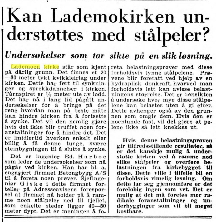 Før jul i 1949 ble det i Lademoen kirke oppdaget en sprekk i buen over søndre tverrskip. Det ble med én gang bygget forstøtninger under buen, og det ble improvisert slik at gudstjenester kunne skje i kirkens vestende. Man oppdaget at kirken sank under tårnet. Målinger viste at man måtte ca. 48 meter ned for å finne fjell. Lademoen hvilte på grus og kvikkleire.