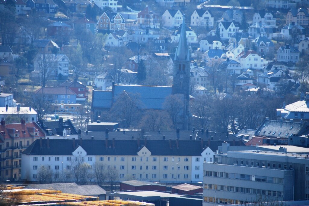 Under: Lademoen kirke fotografert fra Våttahaugen i 2011. Foto: Bjørn Lien.