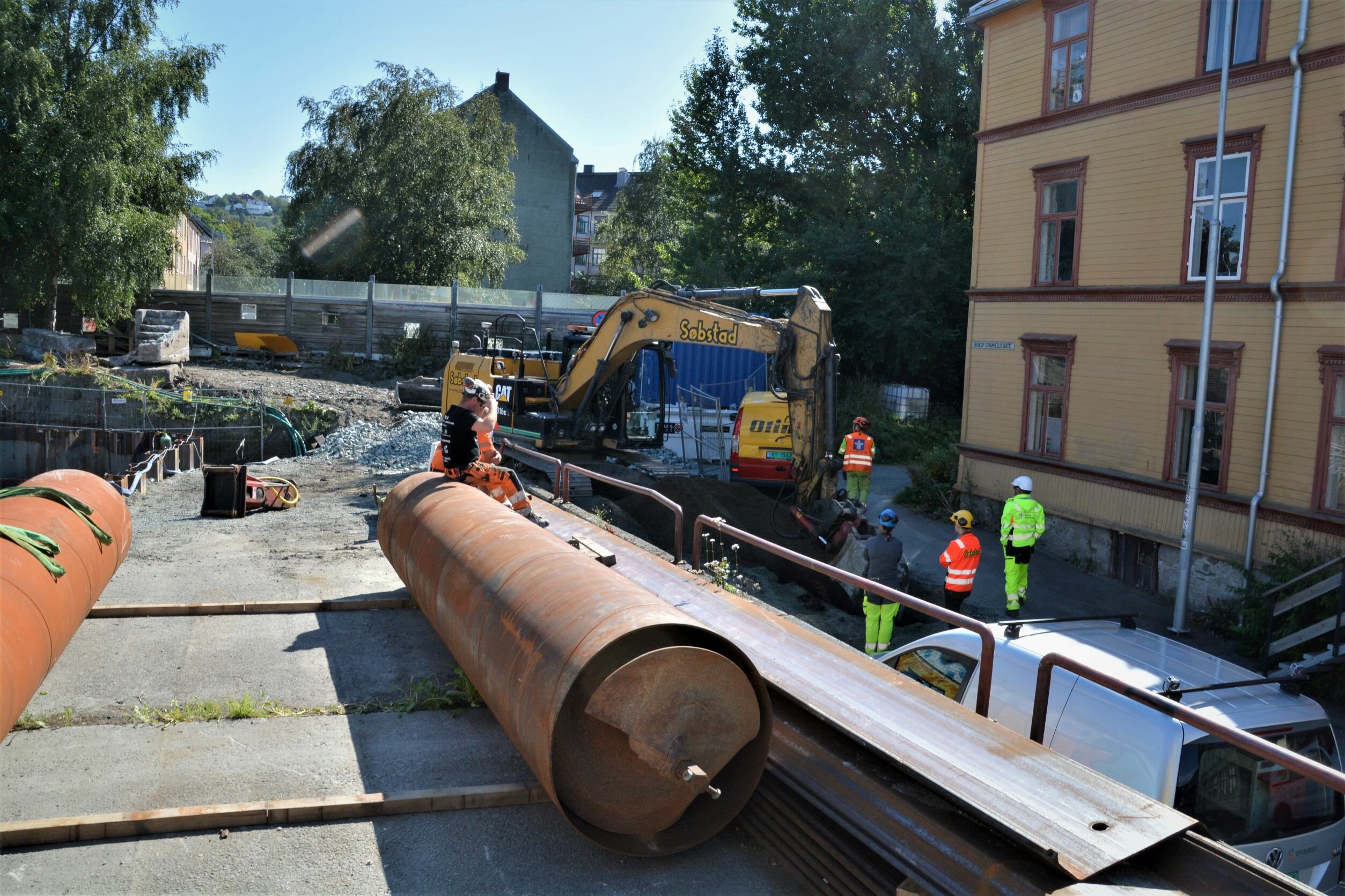 Over: Gamle rør i Biskop Grimkjells vei skiftes ut. I forbindelse med at Innherredsveien blir miljøgate skal mer enn 100 år gamle rør skiftes ut. På bildet holder man på å legge en rørstruktur under toglinjen på vei til Biskop Sigurds gate - mens togene er i full drift. Rør fra fra Strandveien er skiftet ut. Foto: Bjørn Lien.