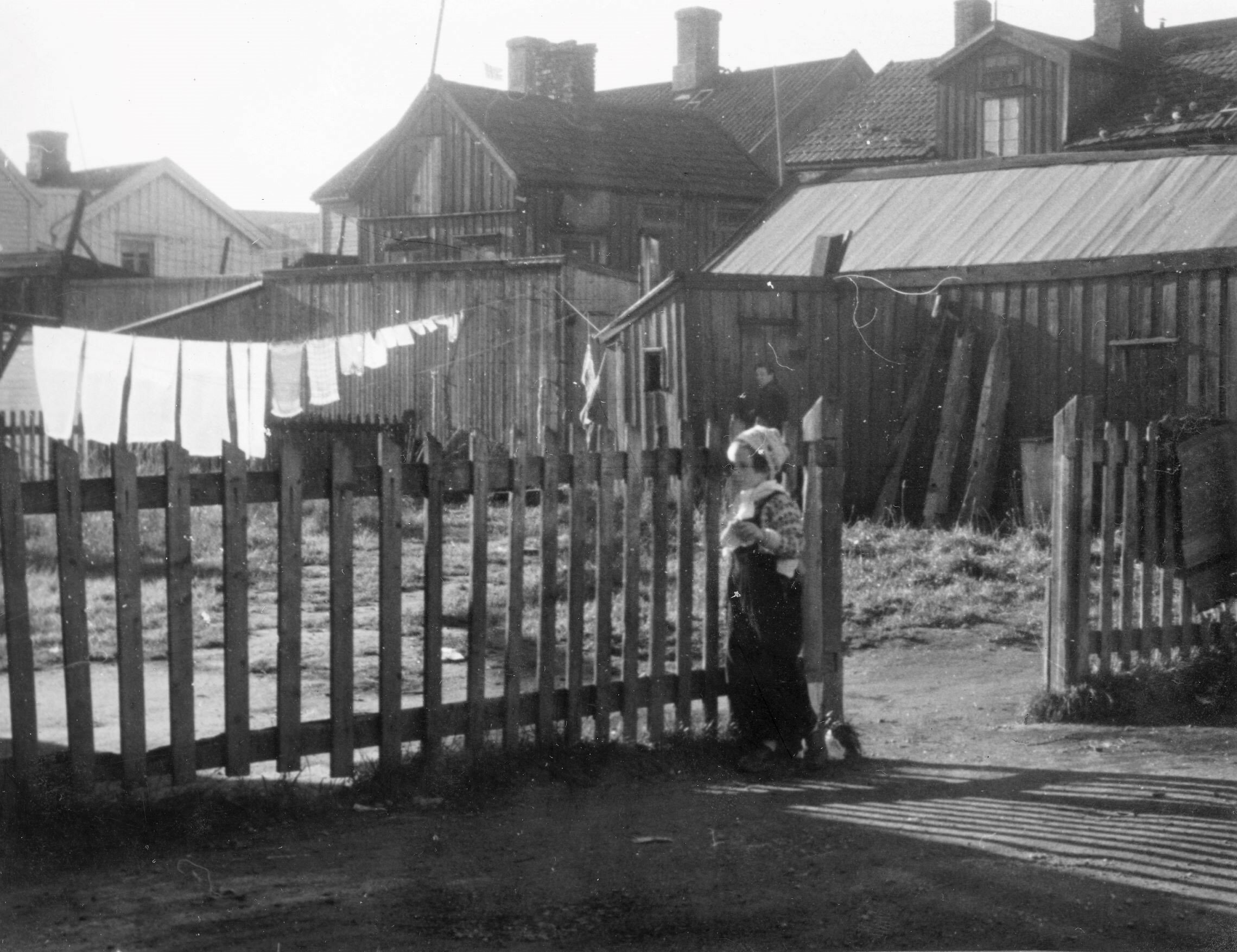 "En liten jente står et sted i kvartalet Strandveien / Reina (tidligere Marcus Thranes gate og Gerhard Schønings gate) / Rosenvinges gate på Lademoen. Bildet er tatt i forbindelse med Sverre Pedersen boligundersøkelse.